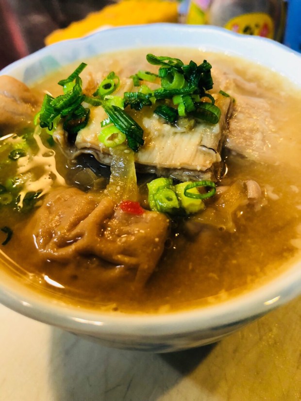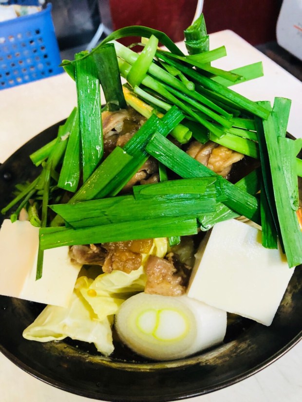 カウンターで お一人様の お客様の 特製大トロもつ煮。