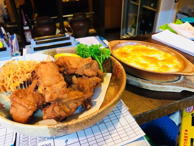 裏ごしポテトのチーズ焼き、骨付きモモ肉の唐揚げ❗️
