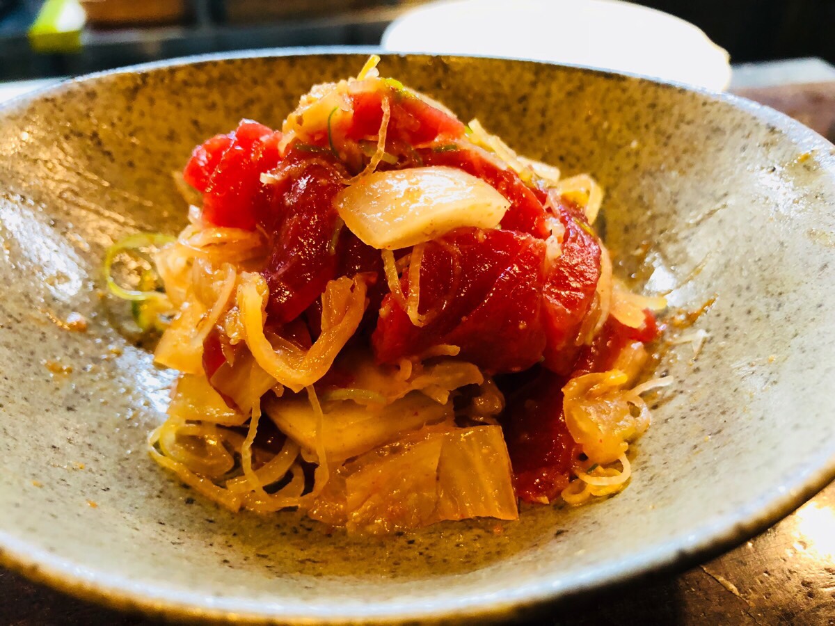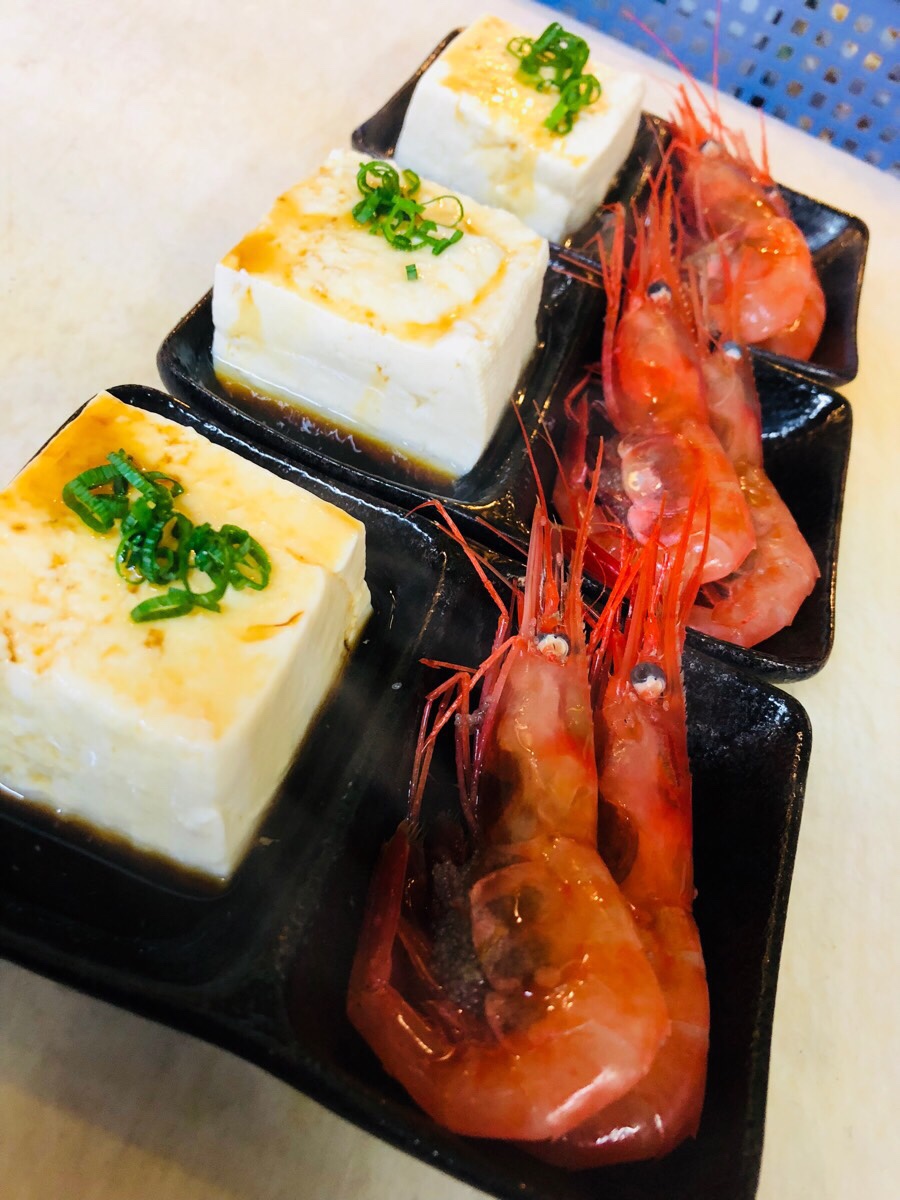 お通しは、こだわり木綿豆腐の湯豆腐と甘海老刺し❗️