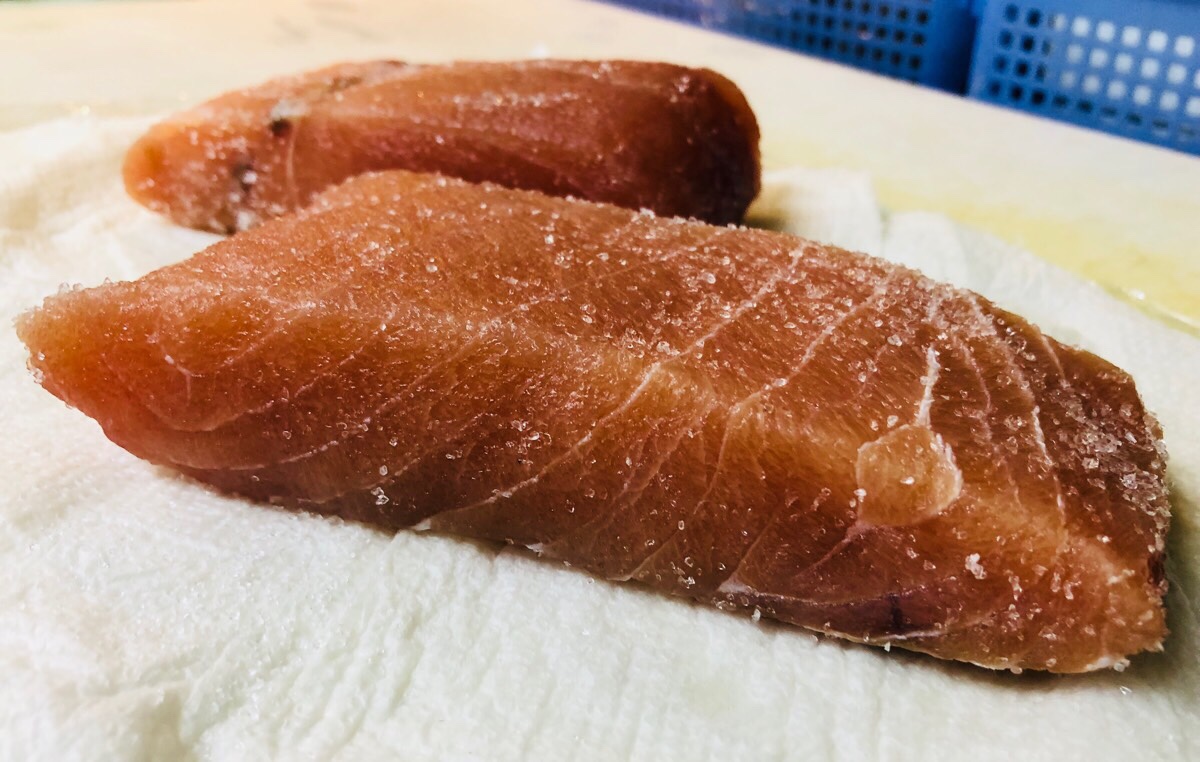 さて、お店の仕込みの方ですが、前日 買い付けました、マカジキを塩〆しまして。