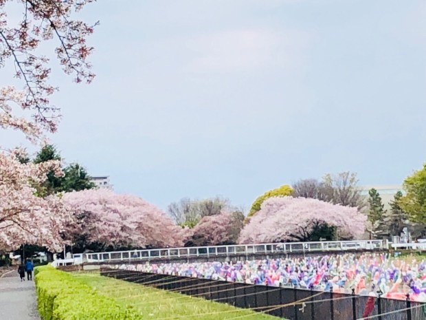 帰り道、まだ遠くから見ると 綺麗に見える、桜と鯉のぼり🎏🌸