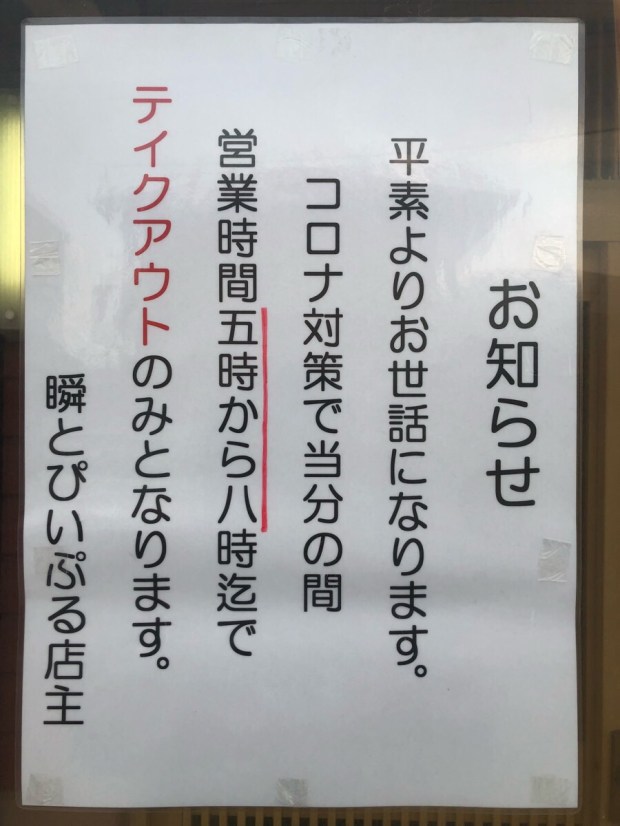 瞬ぴぃは、群馬県の緊急事態宣言が出てすぐに、時間短縮営業としまして、テイクアウトのみの営業に切り替えさせて頂きました。