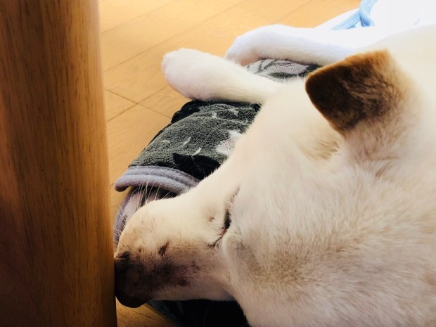 寝たと思ったら、お鼻をテーブルの脚に グイーッと(≧∀≦)