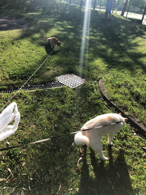 朝陽を浴びながら、朝の お散歩から1日が始まりましてーU^ェ^U