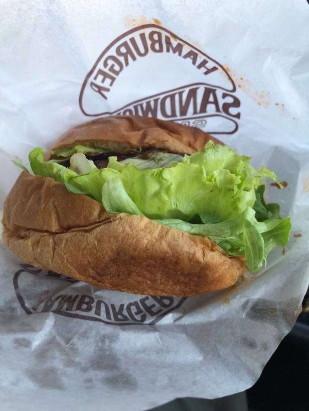 お昼は どこかのテイクアウトを考えておりましたが、時間的に 厳しくなりましたので、調べてみましての 老舗のパン屋さんで ハンバーガーパン!
