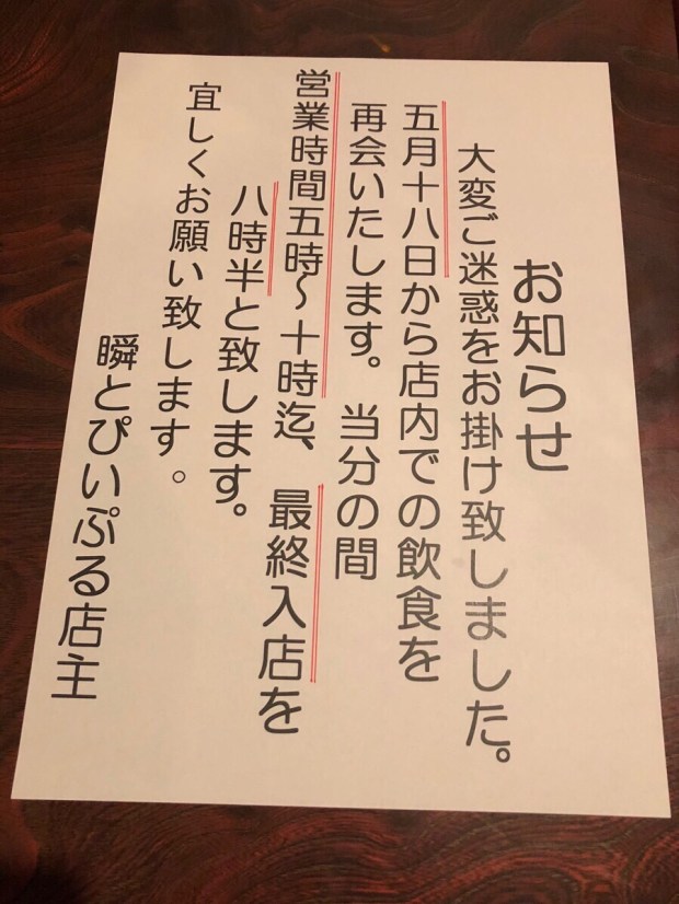 お休み後の月曜日より、店内飲食営業の再開となります。