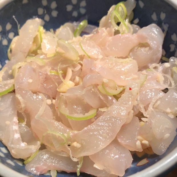 お通し用に 真子鰈の塩ユッケ。