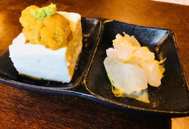 お通しは、雲丹ヤッコと真子鰈の塩ユッケ。