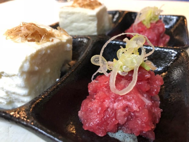 店内飲食営業の方は、こだわり豆腐のヤッコとマグロ叩きの お通し。