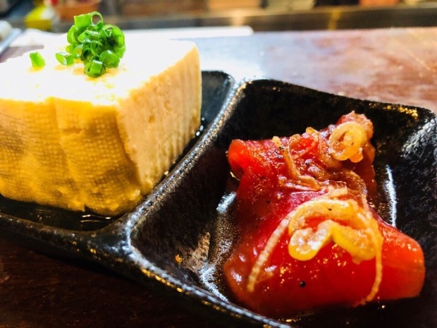 店内飲食の方は、こだわり豆腐のヤッコとマグロユッケの お通しでスタート!