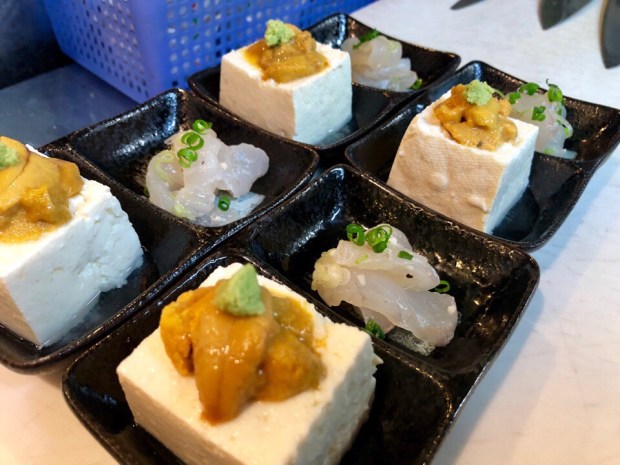 こだわり豆腐の上に雲丹をのせましての 雲丹ヤッコと平目の塩ユッケ。