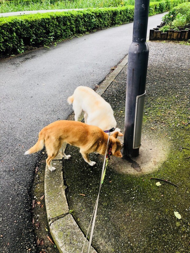 道路が濡れていようが、雨が降っていようが、いつもと変わらず お散歩を楽しめるのが うちの子達です(⌒▽⌒)