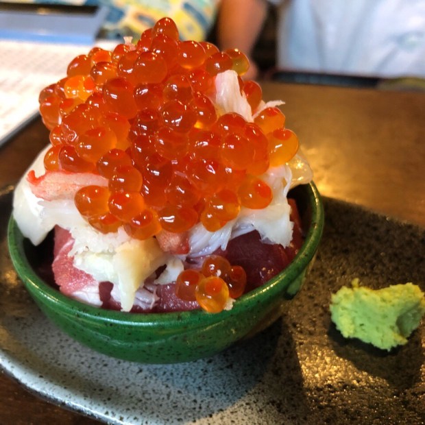 の 小鉢まぐろ盛り ホタテ 蟹 いくらのせ。