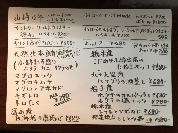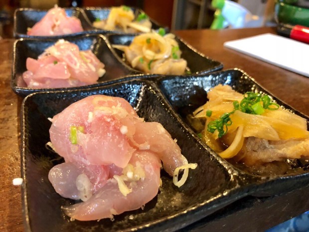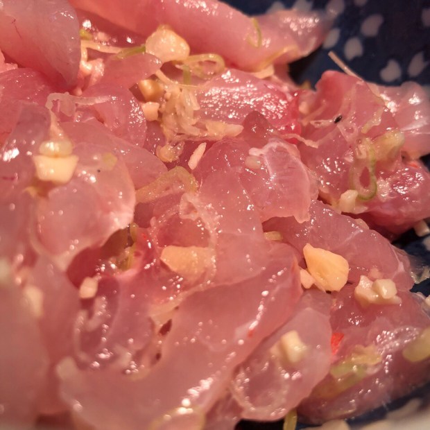 5時に開店となりまして、お通しは 金目鯛の塩ユッケと鯵の南蛮漬け。