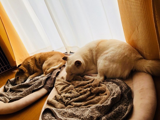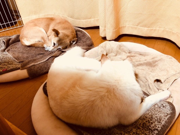 午後のシッコタイムを 冷んやりロードで済ませまして、御飯食べてーの、シンクロ寝zzz…。