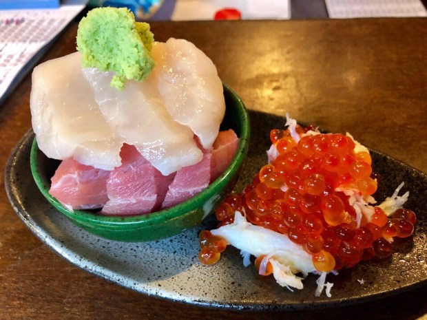 中トロ、ホタテ、蟹、イクラの盛り合わせで、感謝の気持ちを形に価格、ナナヒャクナナジューエ〜〜〜ンo(^_-)O