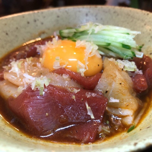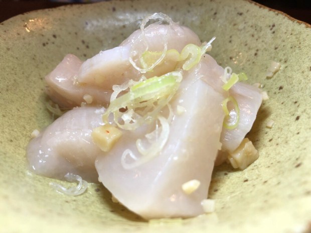 こだわり木綿豆腐のヤッコとホタテの塩ユッケの お通し。