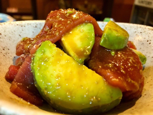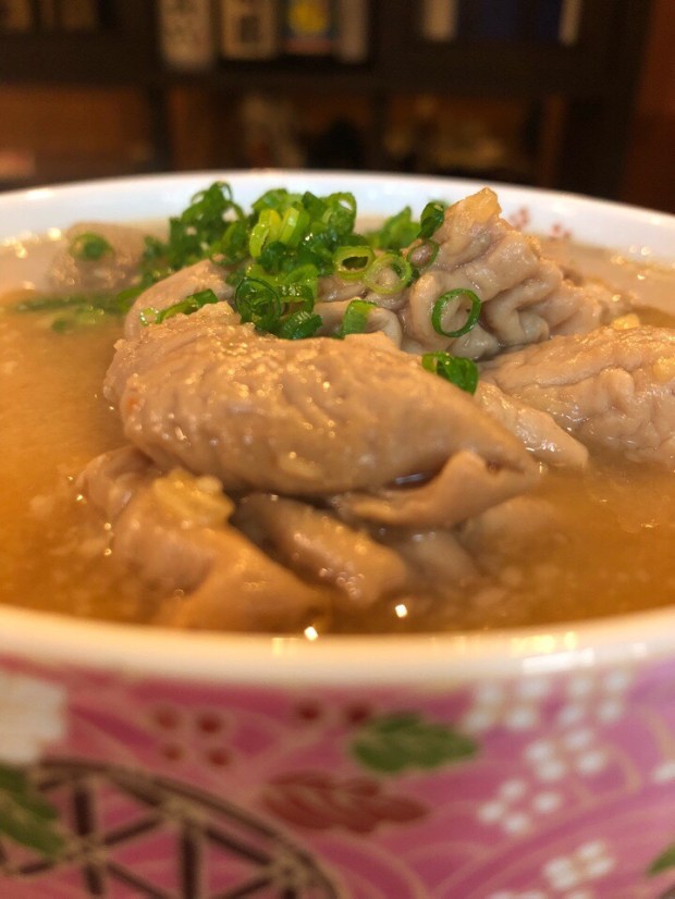 店内飲食の方は、特製 豚の大トロもつ煮と鮪の竜田揚げ。