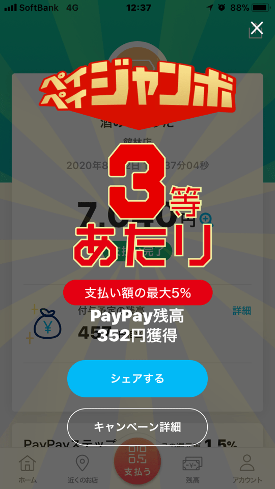 買い物の流れで、酒屋さんへ寄りまして、ペイペイ決済しますと、三等賞(≧∀≦)