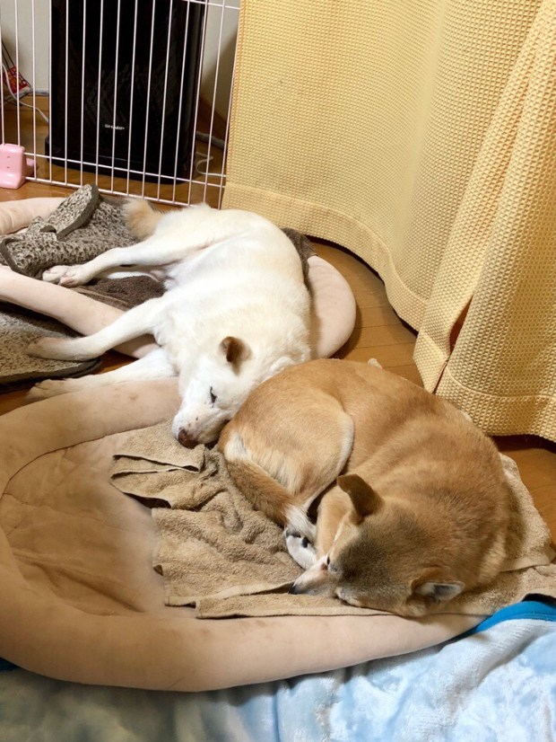 お殿様が寝ている所に、いつもの仕返しの如く、お尻をドーン!しました ヒバ子(爆)