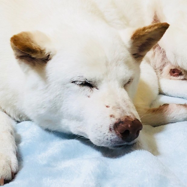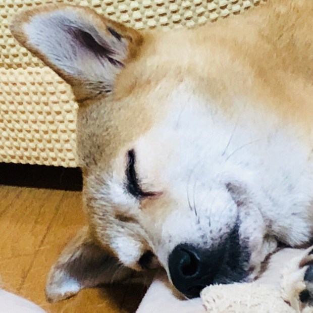 お仕事終わって 帰宅しますと、おじーワンは お鼻を押し付けて 爆睡(≧∀≦)