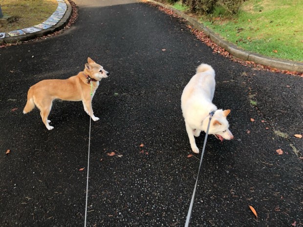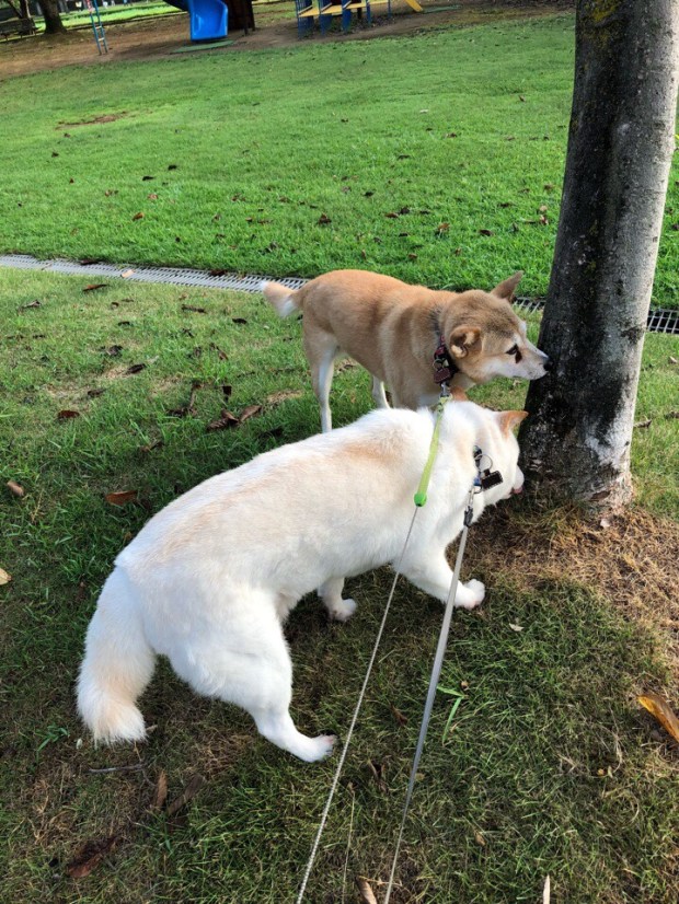 戻ってきても、まだ怖いのか お殿様の後ろに隠れてみたりー( ^ω^ )