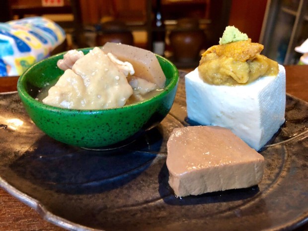お通しは、特製 豚の大トロもつ煮、鮪の角煮、雲丹豆腐。