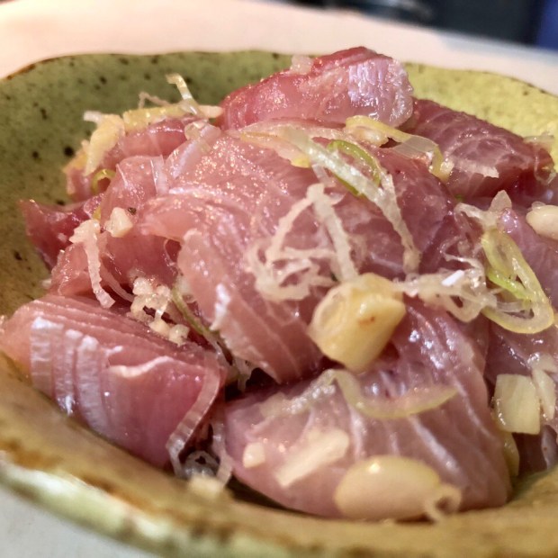 ネギトロと中トロ炙り、雲丹 イクラの 本日の小鉢まぐろ盛り。