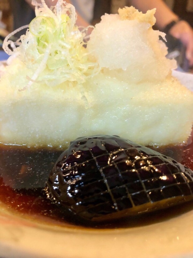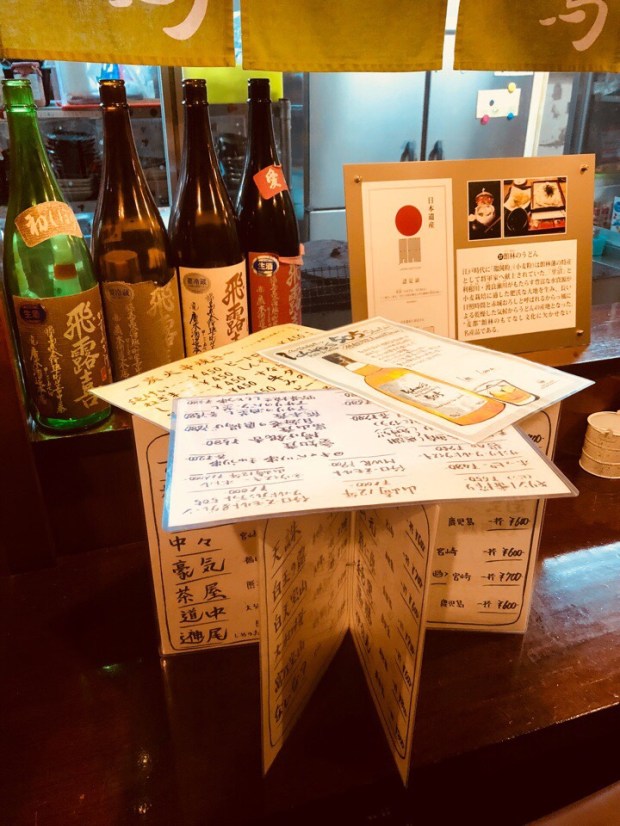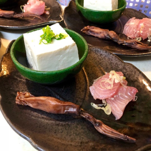 店内飲食の方は、こだわり木綿豆腐のヤッコ、ぶりの塩ユッケ、スルメイカの丸干し炙りの お通し。