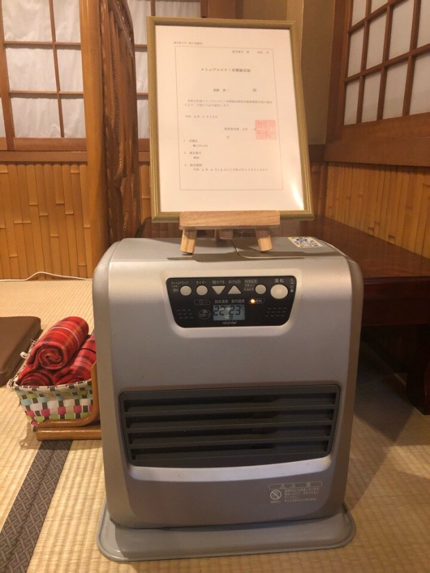 換気の為、入り口の扉を少し網戸にしますので、寒くならないように ファンヒーターを置いてみましてー。