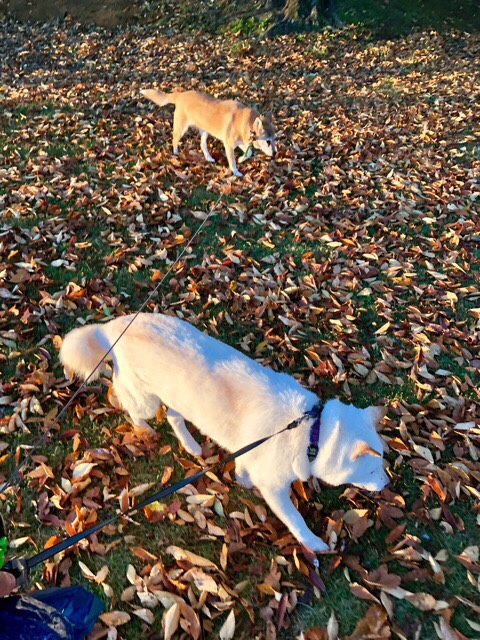 朝陽を浴びながら、落ち葉の絨毯で シッコタイムの ヒバ子さん∩^ω^∩