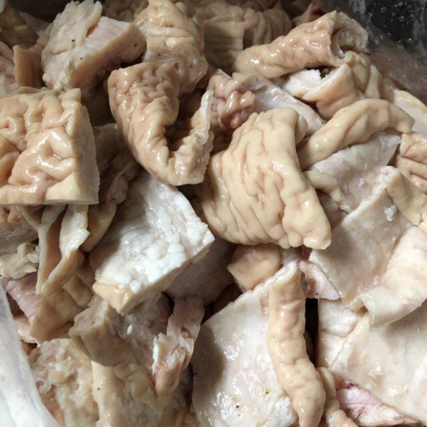 特製もつ煮用に、豚の大トロ部分の テッポウを掃除しまして カット〜。