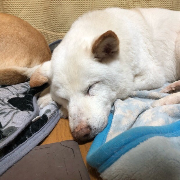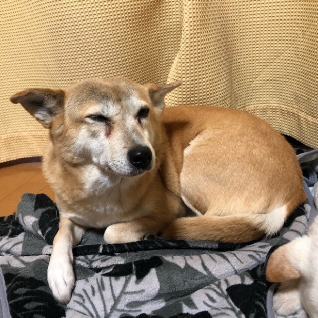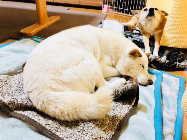 朝起きまして、リビングへ降りて行きますと、おじーワンは まだ爆睡中でした( ^ω^ )