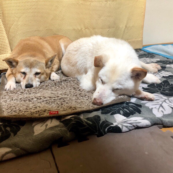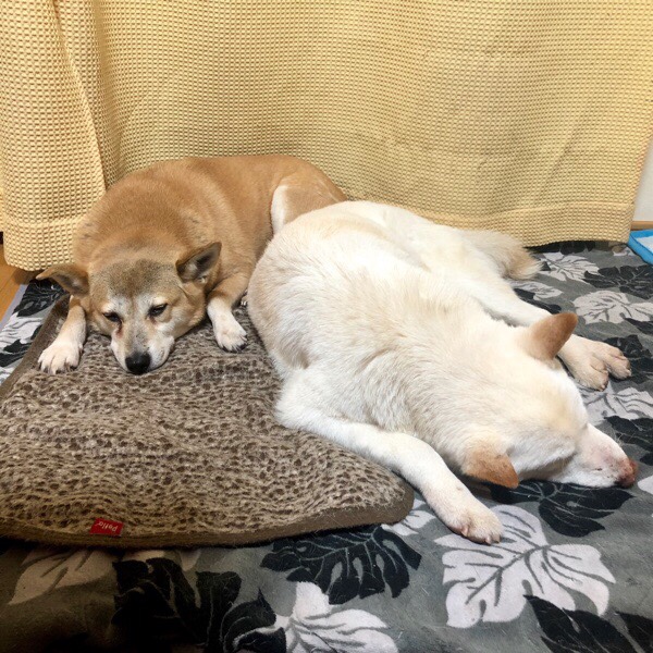 お家に戻りまして、シッコさせて お風呂入って、二人を見ますと 並んで 寝んねzzz… 。