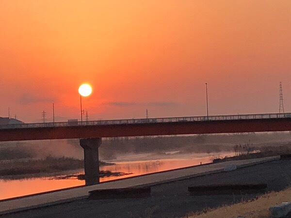 朝陽が渡良瀬川を登るなか、ゴミ拾いのボランティアでございます。