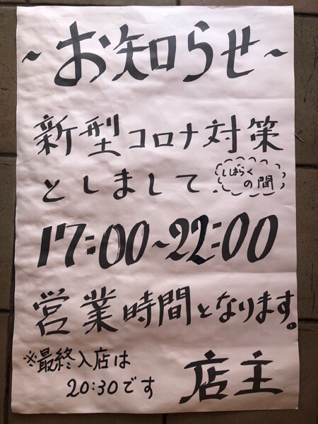 最終入店が 20時半となりますので、その時間以降 お客様が切れた時点で 閉店となりますので、お気をつけ下さいm(_ _)m