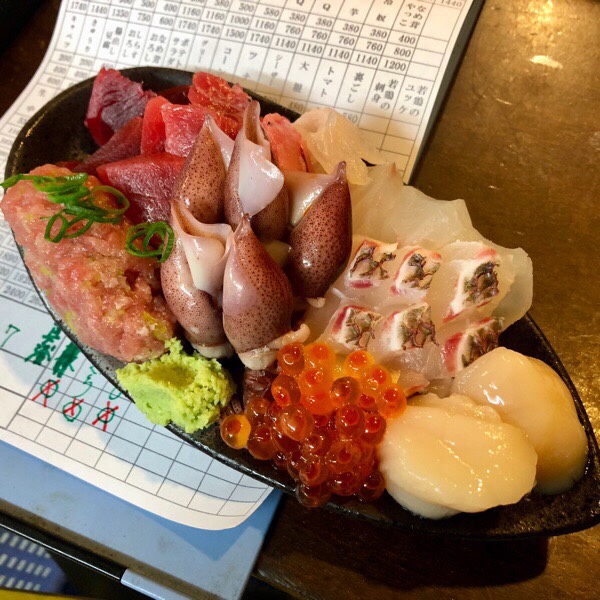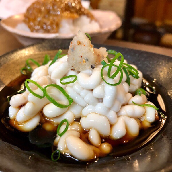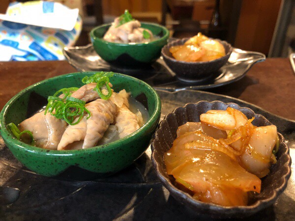 店内飲食の方は、特製大トロもつ煮と海鮮ユッケの お通し。