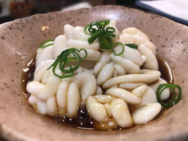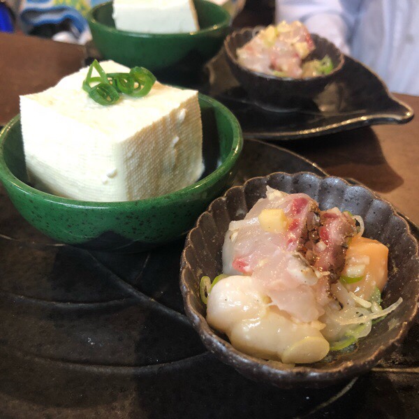 お通しは、こだわり豆腐のヤッコとホタテと真鯛の塩ユッケ。