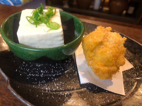 こだわり豆腐のヤッコと白子フライの お通し。