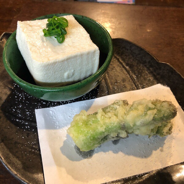 お通しは、こだわり木綿豆腐のヤッコとタラの芽の天ぷら。
