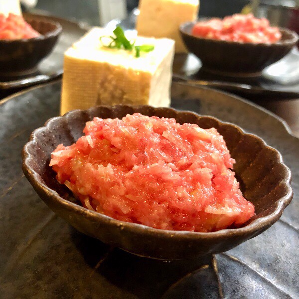 お通しは、まぐろたたきの塩ユッケ風と こだわり豆腐のヤッコ。