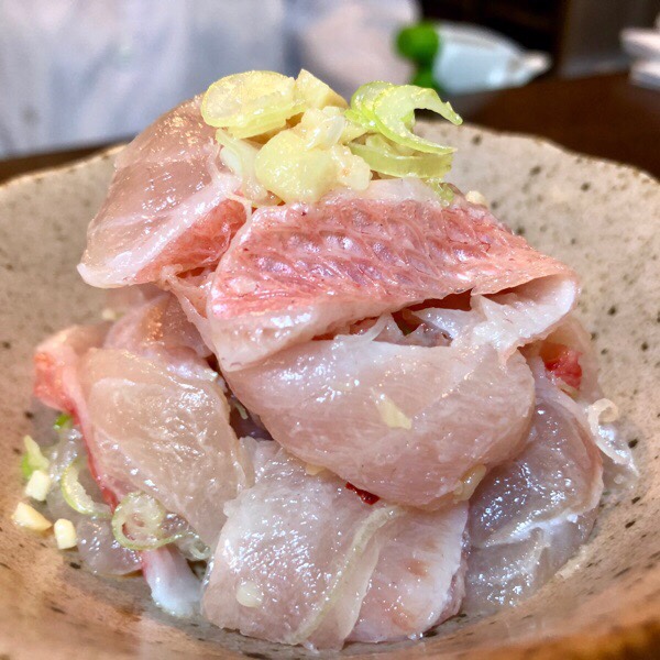 贅沢に 金目鯛の塩ユッケと こだわり豆腐のヤッコが お通し。