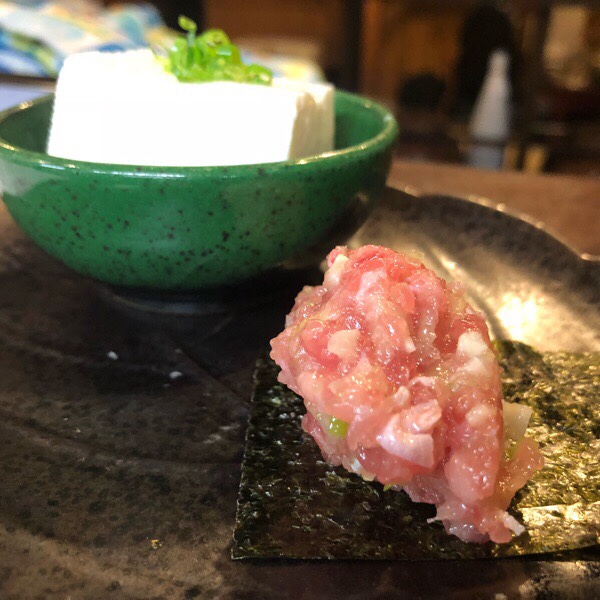 お通しは、こだわり豆腐のヤッコとネギトロ 塩ユッケ風 。