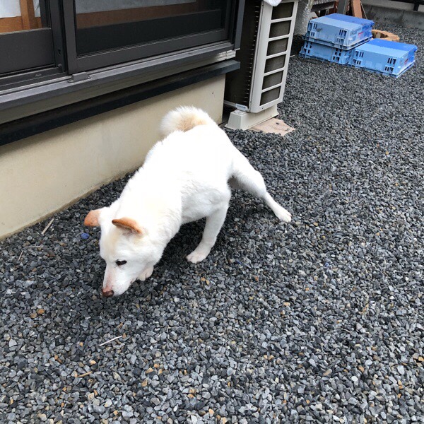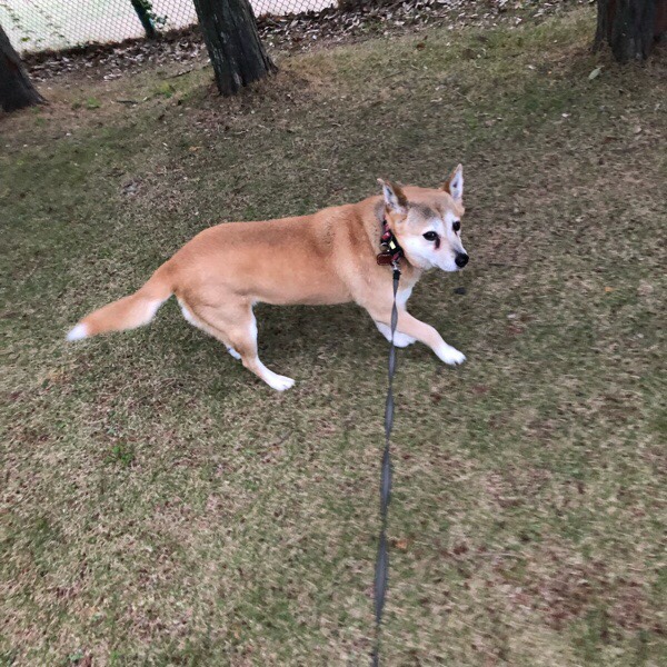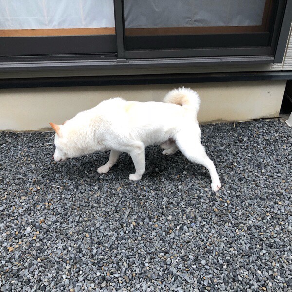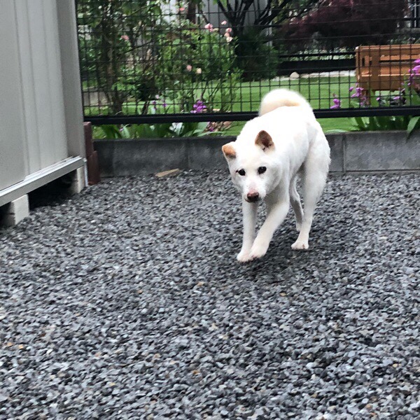 早朝でも 元気に お庭お散歩の グッチおじーワン(⌒▽⌒)
