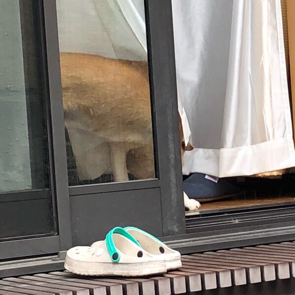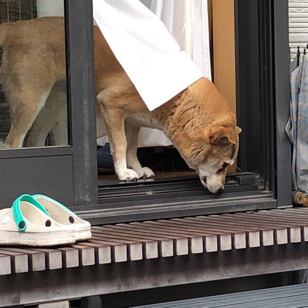 朝起きまして、グッチおじーワンの お庭お散歩をしておりますと、ヒバ子さんが珍しく 気になったようで、覗きに〜🎶