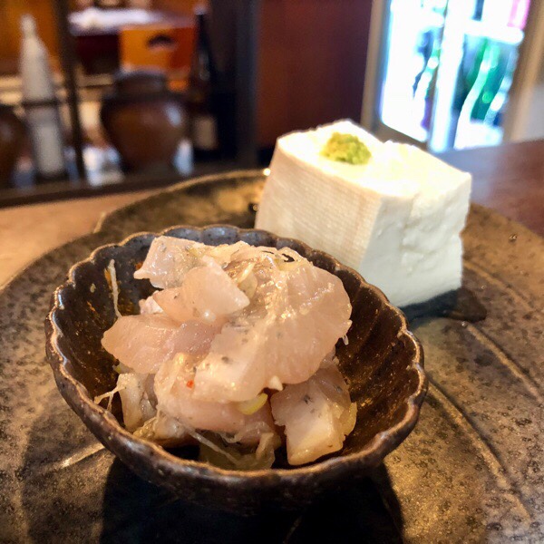 太刀魚の塩ユッケと こだわり豆腐のヤッコが お通し。