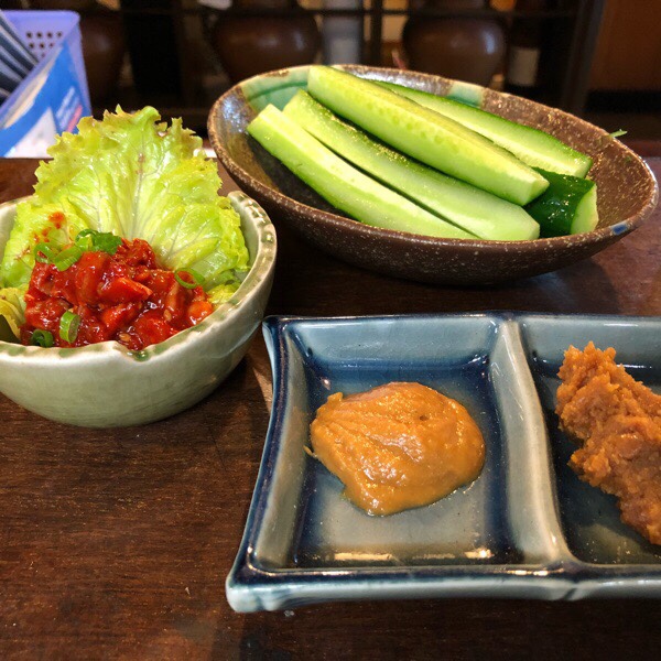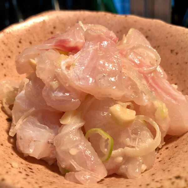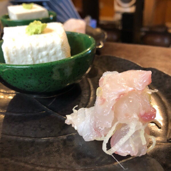 5時に開店となりまして、お通しは 入荷したての ブリブリの 鮃の塩ユッケと こだわり豆腐のヤッコ。