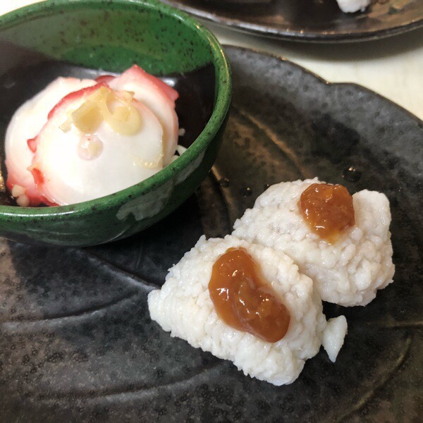 ガーリックタコと ハモの湯引きの お通し。