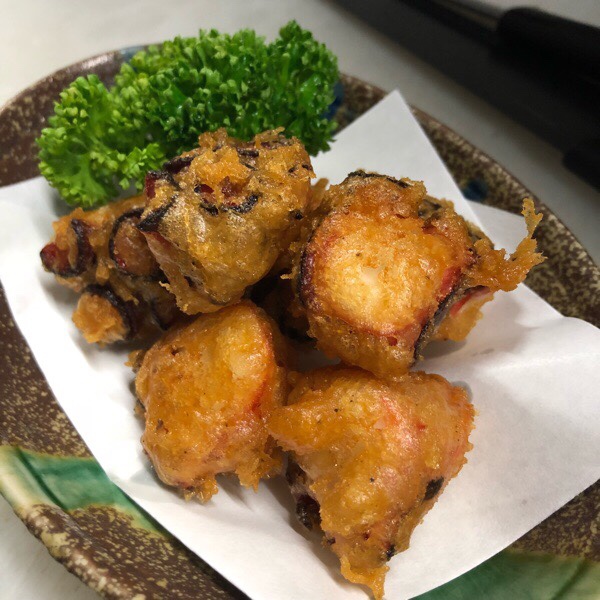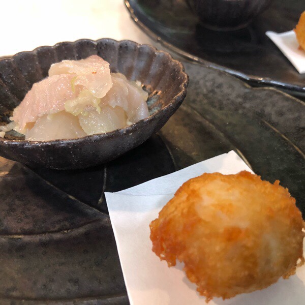 真子鰈の塩ユッケと鱧の唐揚げが お通し。
