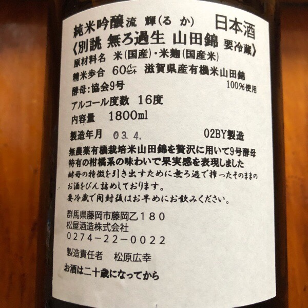 群馬県 流輝 純米吟醸 別跳 無ろ過生 山田錦